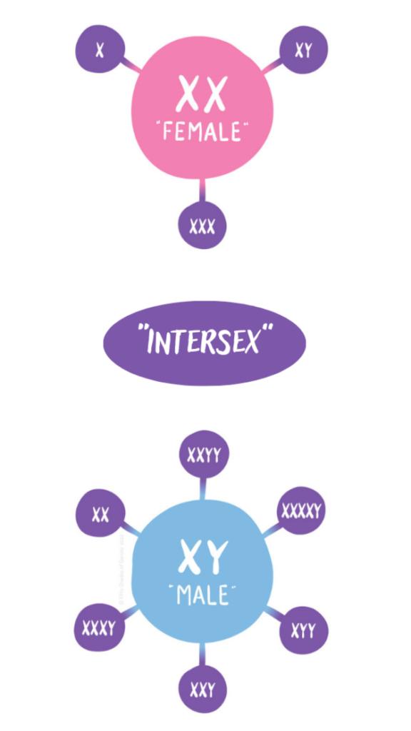 • Les personnes intersexes, c’est-à-dire nées avec des caractéristiques sexuelles (chromosomiques, gonadiques, hormonales ou anatomiques) qui ne correspondent pas strictement aux définitions médicales typiques du féminin ou du masculin